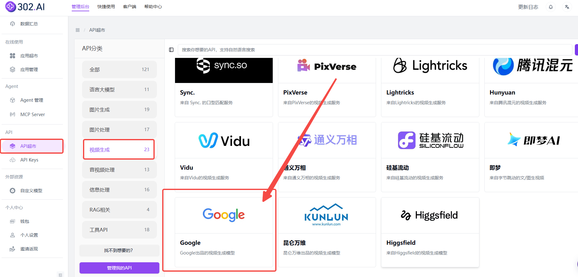 相关文档:API→API超市→视频生成→Google→查看文档;